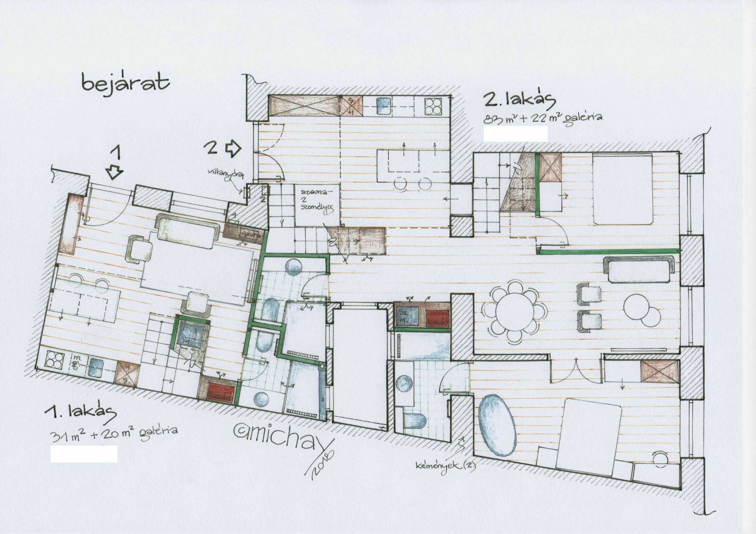 Nappali + 2 háló (galériás megoldással), 1 fürdőszoba