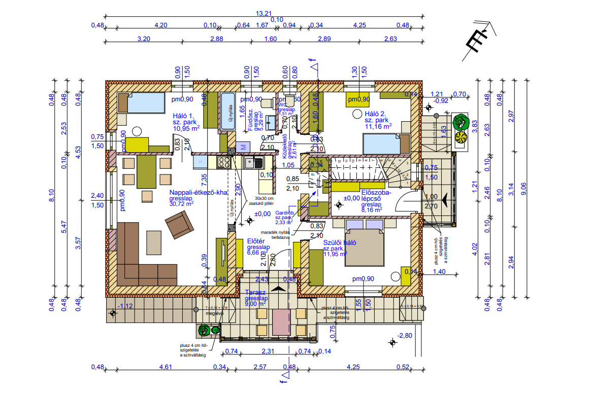 Mindkét lakás nappali + 3 hálószobával rendelkezik, külön WC-vel, 1 fürdőkádas fürdőszobával. A TÁROLÓ 20-20 m2 mindkét lakáshoz. 3 rétegű nyílászárók kerültek be, 15 cm HŐSZIGETELÉS a 30-as tégla falazatra. HŐSZIVATTYÚS PADLÓFŰTÉS lett kiépítve, padló felől új rétegrenddel. A HŰTÉST lakásonkét 2 db hűtő-fűtő klíma látja el. Teljes közmű, "H" TARIFás hőszivattyú, gáz nem került bevezetésre. Automata kapuk és kaputelefon, riasztó rendszer kiépítve teljesen készre. A tetőszerkezet új, 30 cm kőzetgyapot hőszigeteléssel.