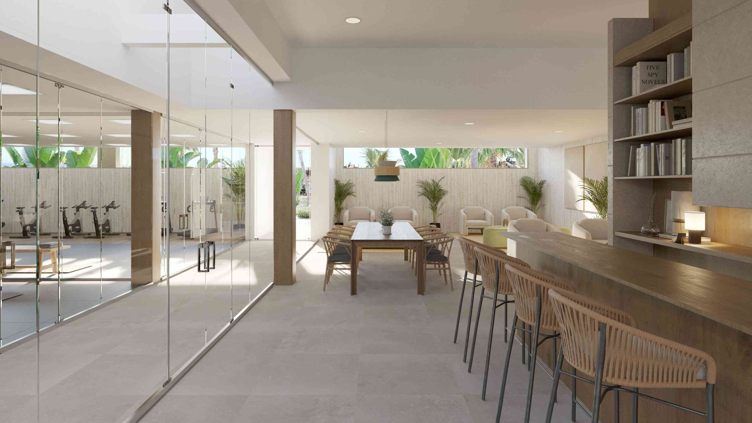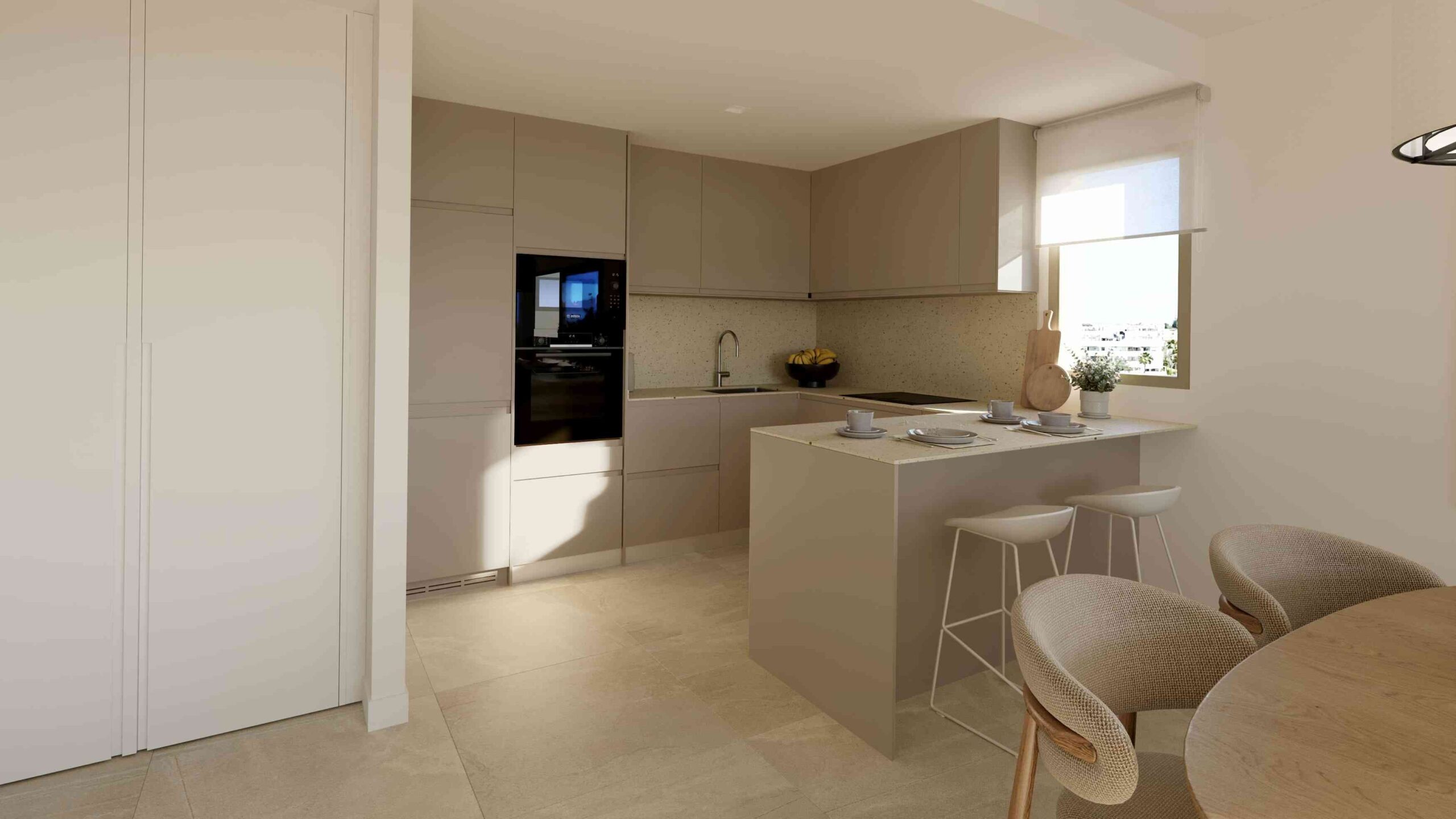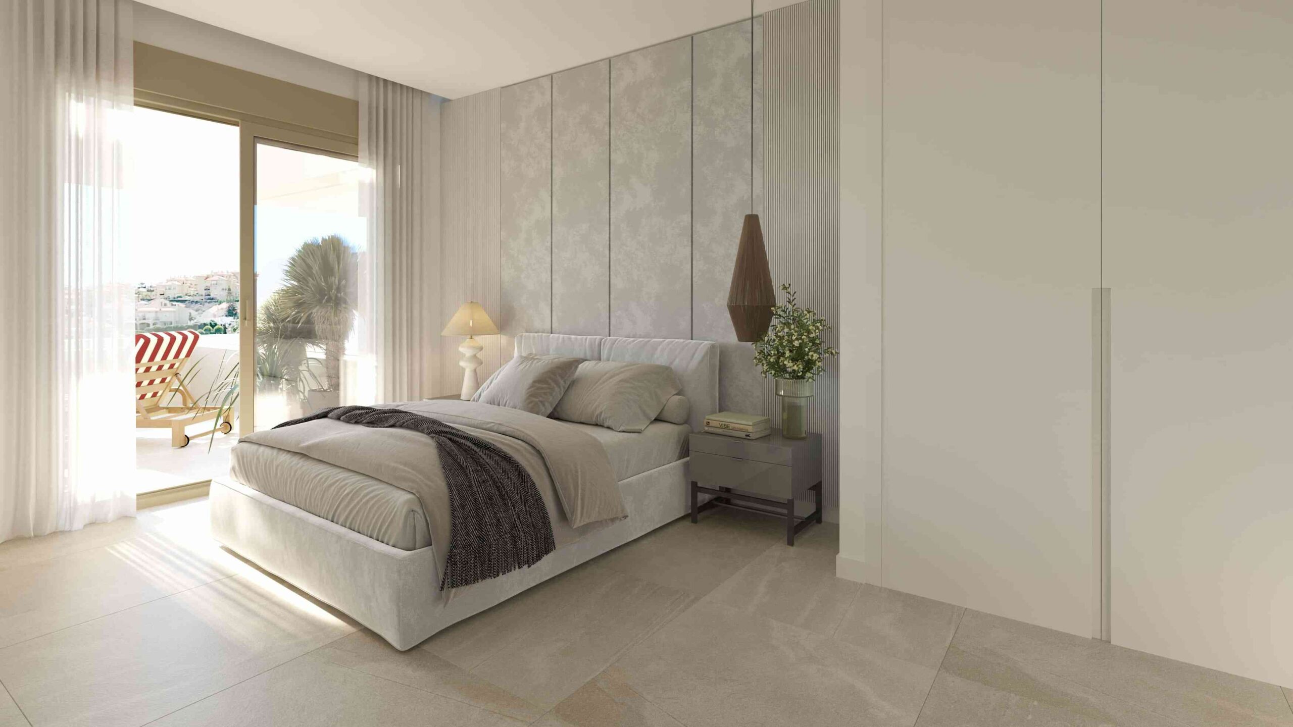 A földszinti, 99 m²-es lakás tágas, világos terekkel rendelkezik, melyek kialakításakor a természetes fény maximális kihasználása és a harmonikus beltéri–kültéri kapcsolat volt a fő szempont. A nappaliból közvetlen kijárat nyílik a saját teraszra, ahonnan lenyűgöző kilátás tárul a Földközi-tengerre.