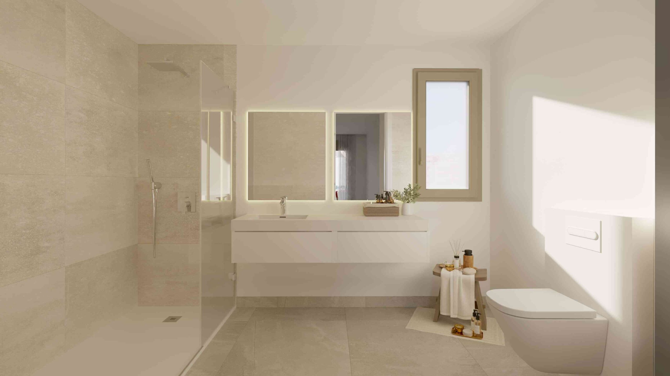 Az ingatlan két kényelmes hálószobával és két modern fürdőszobával rendelkezik. A belső kialakítást a letisztult elegancia és a prémium minőség jellemzi: nagyméretű porcelán burkolatok, fehérre lakkozott nyílászárók, kiváló hő- és hangszigetelés, valamint teljesen felszerelt, csúcskategóriás gépekkel ellátott konyha szolgálja a mindennapi kényelmet. A fürdőszobák korszerű megoldásokkal készültek, többek között fali WC-kkel, üvegfalakkal és hangulatos, háttérvilágítású tükrökkel.