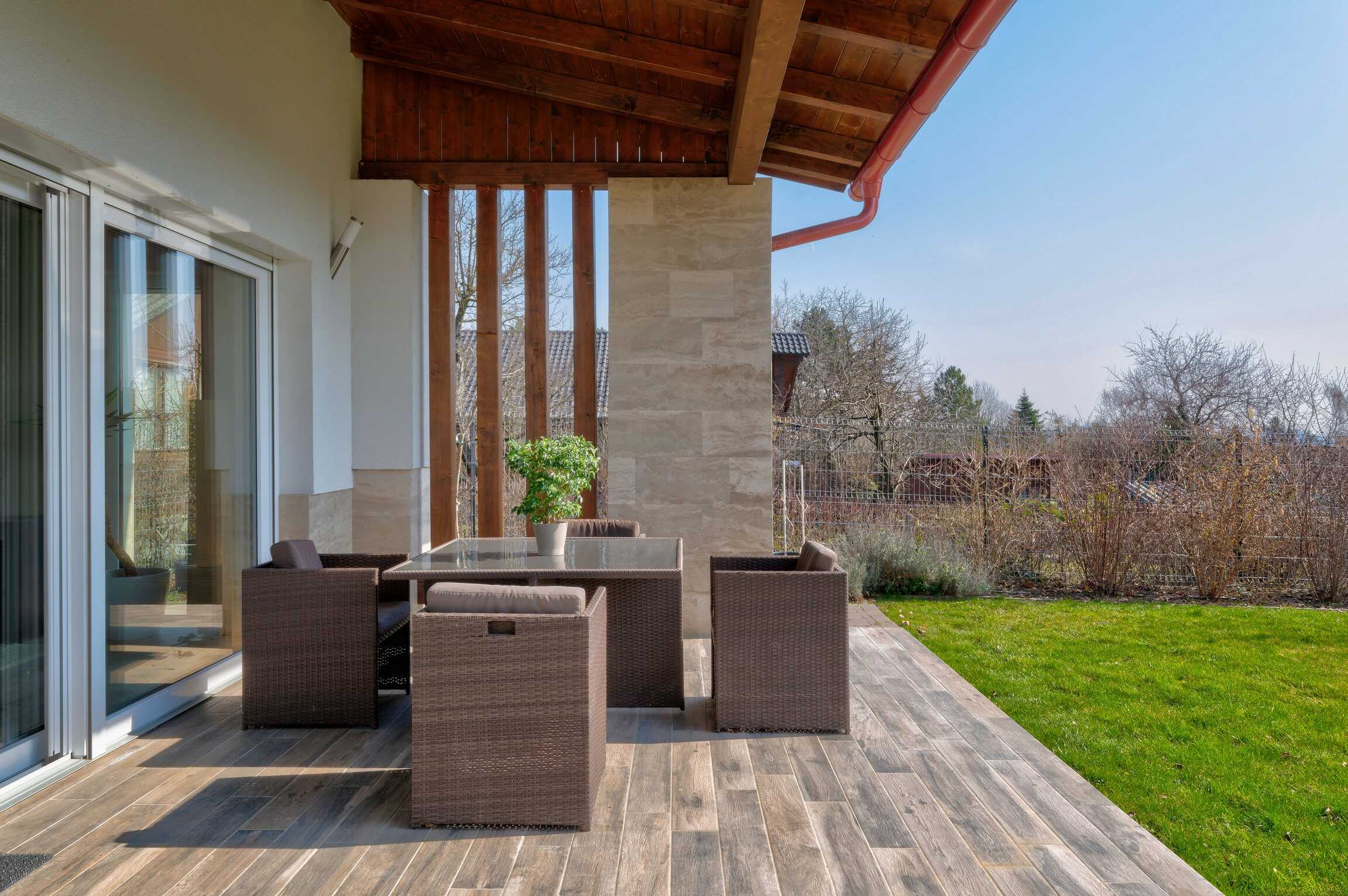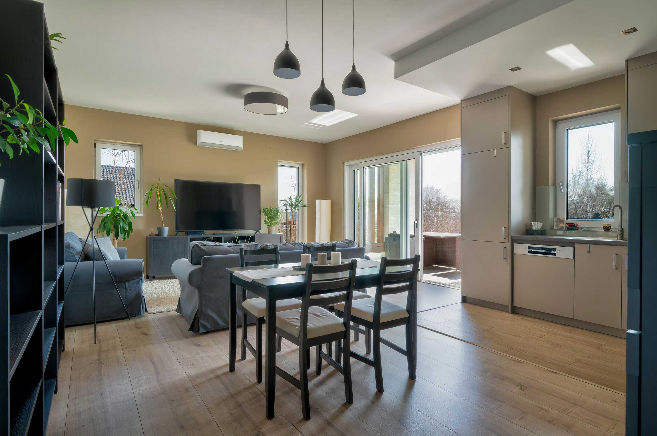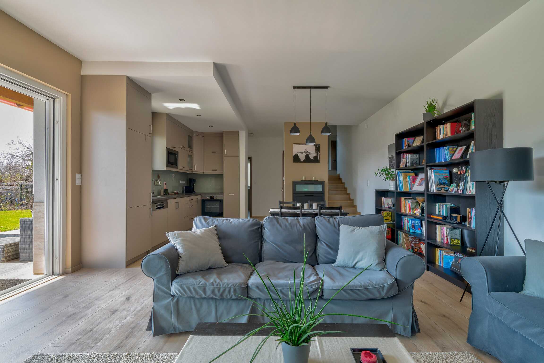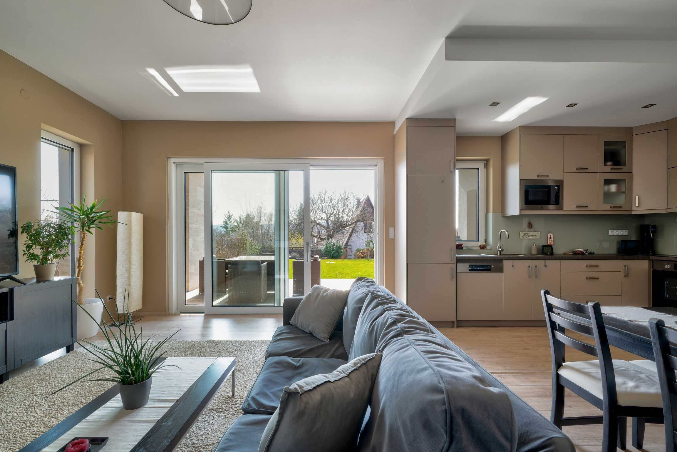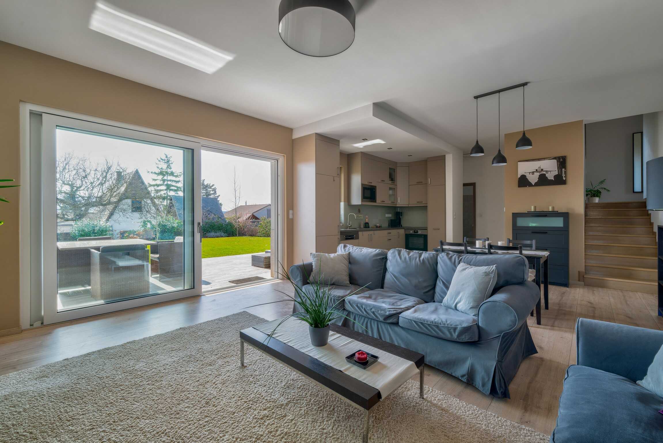 A nagy ablakfelületeknek köszönhetően a terek világosak, a gyönyörű tájolású terasz pedig közvetlen kapcsolatot teremt a kerttel.