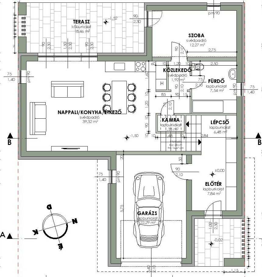 A telek enyhe lejtéséből adódó finom szinteltolással került kialakításra a NAPPALI – KONYHA – ÉTKEZŐ együttes, amely közvetlen teraszkapcsolattal nyílik a kert felé, valamint egy HÁLÓSZOBA, FÜRDŐSZOBA, kamra, előtér, és az egyállásos GARÁZS található itt.