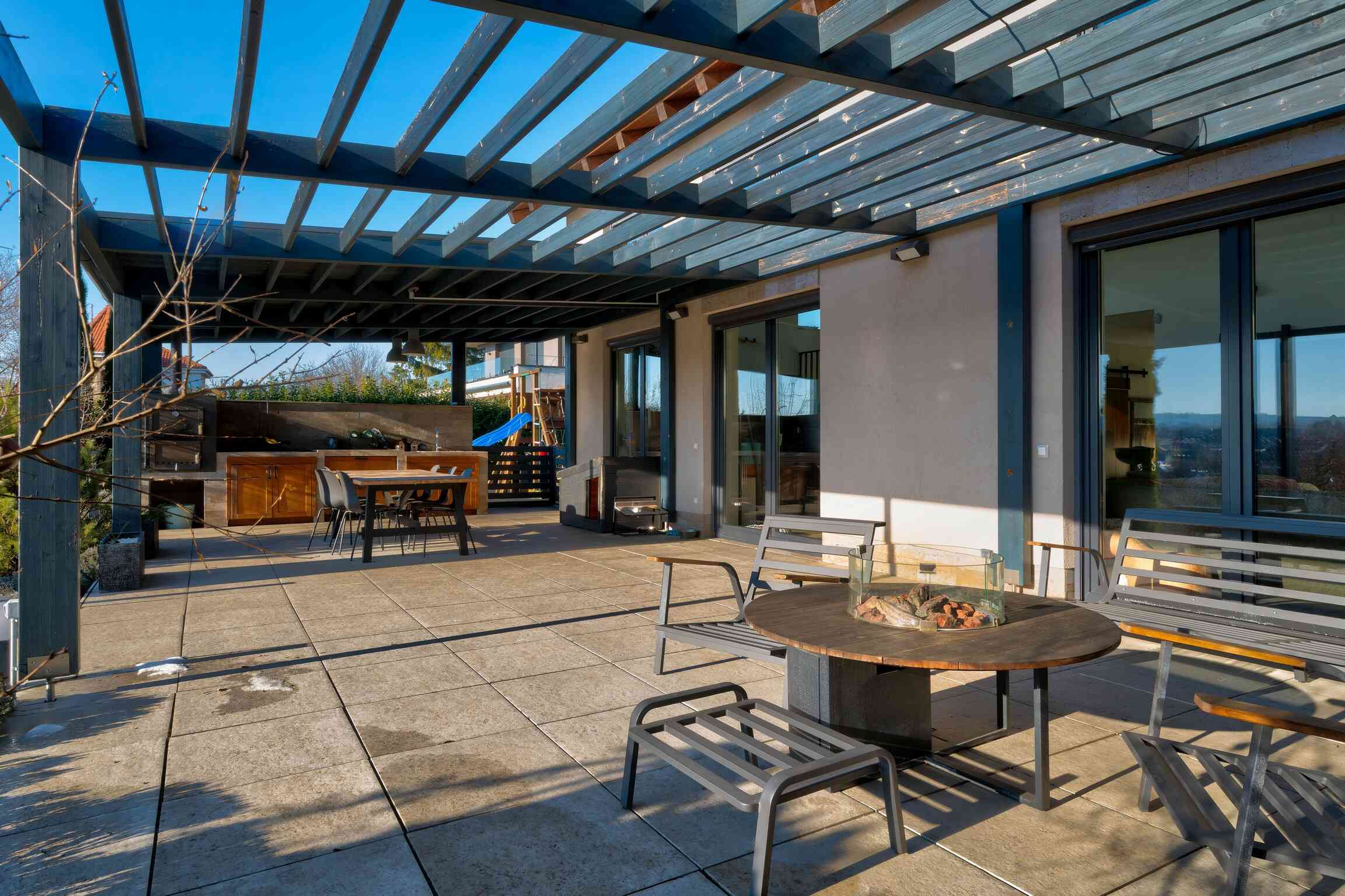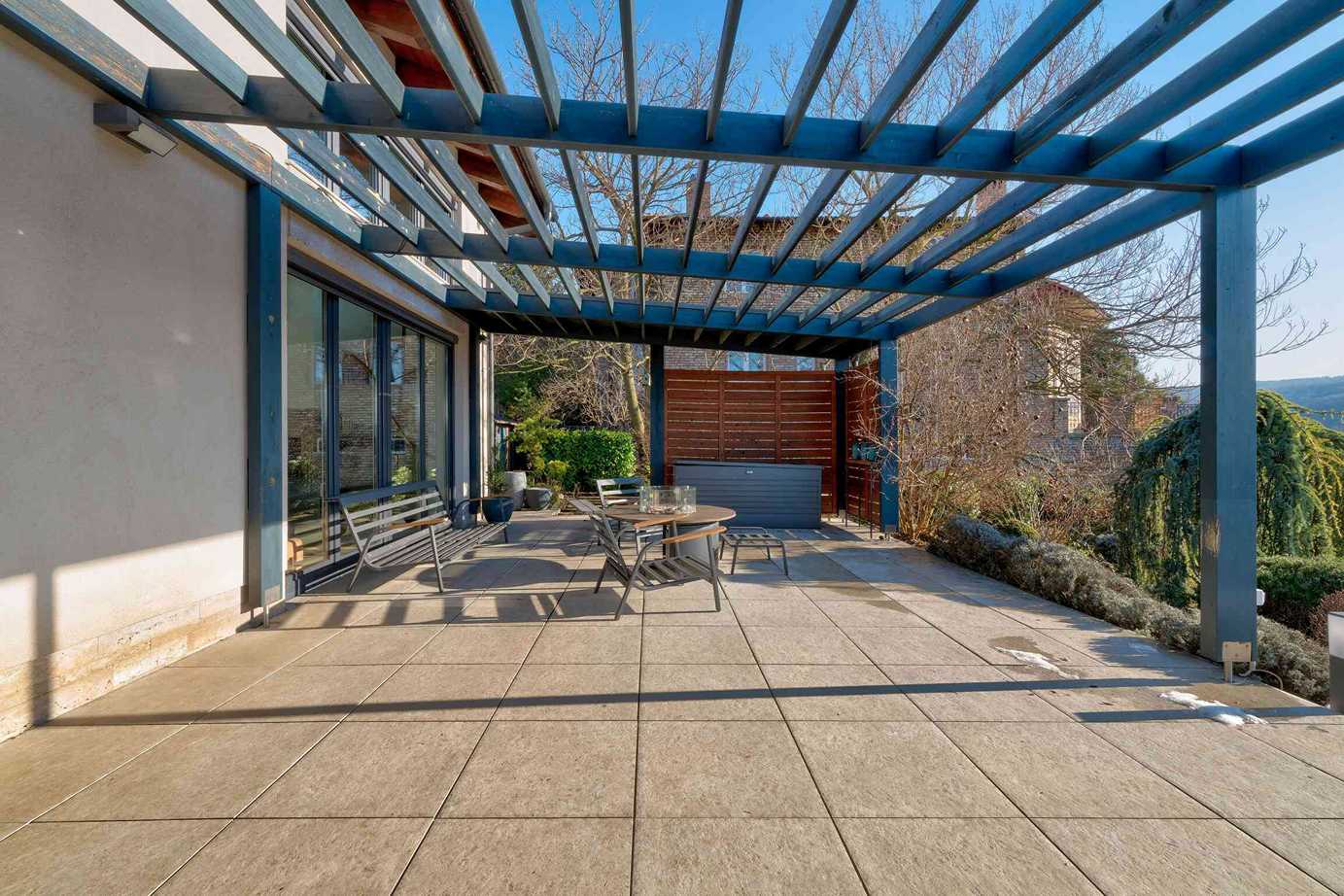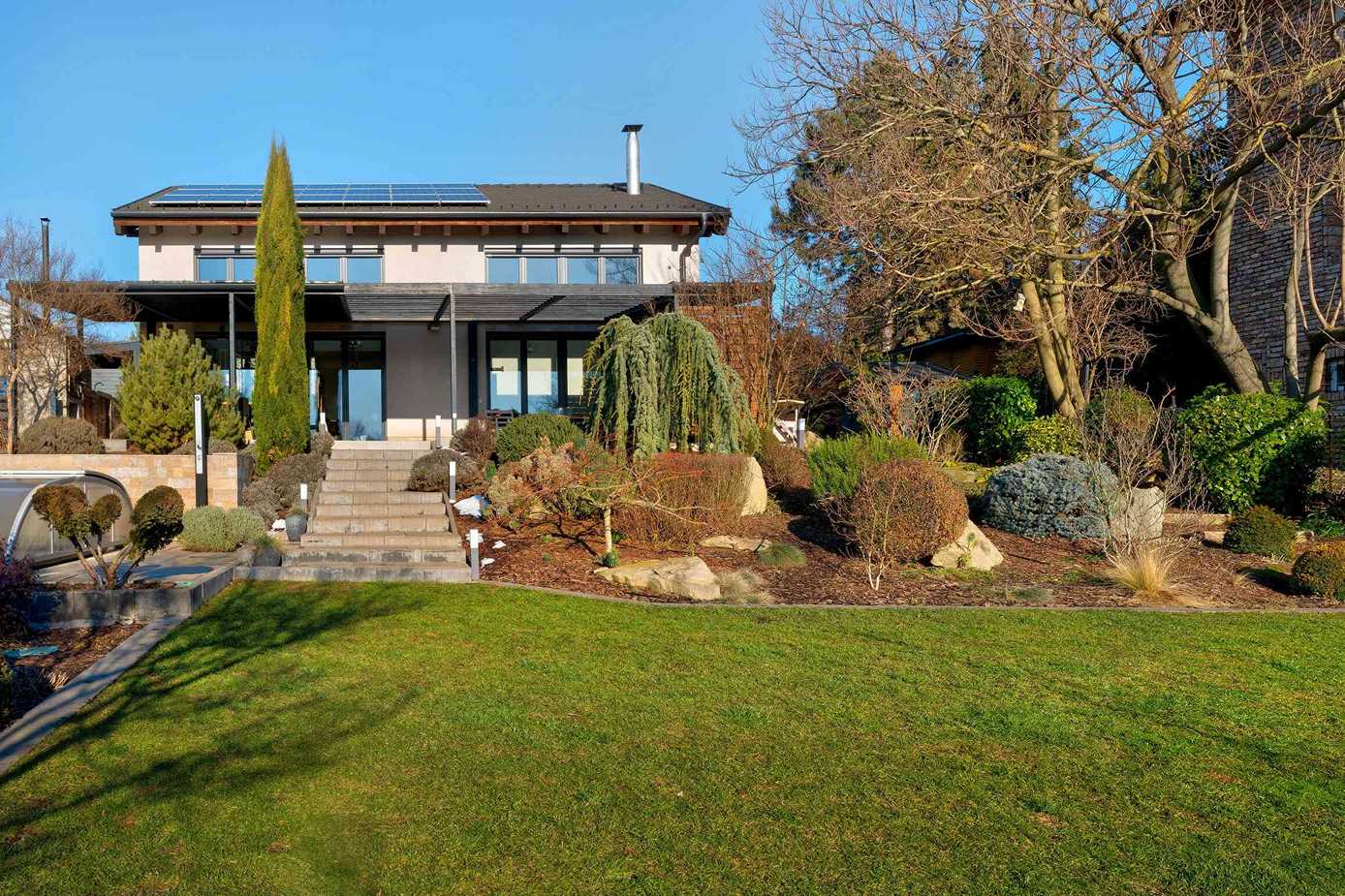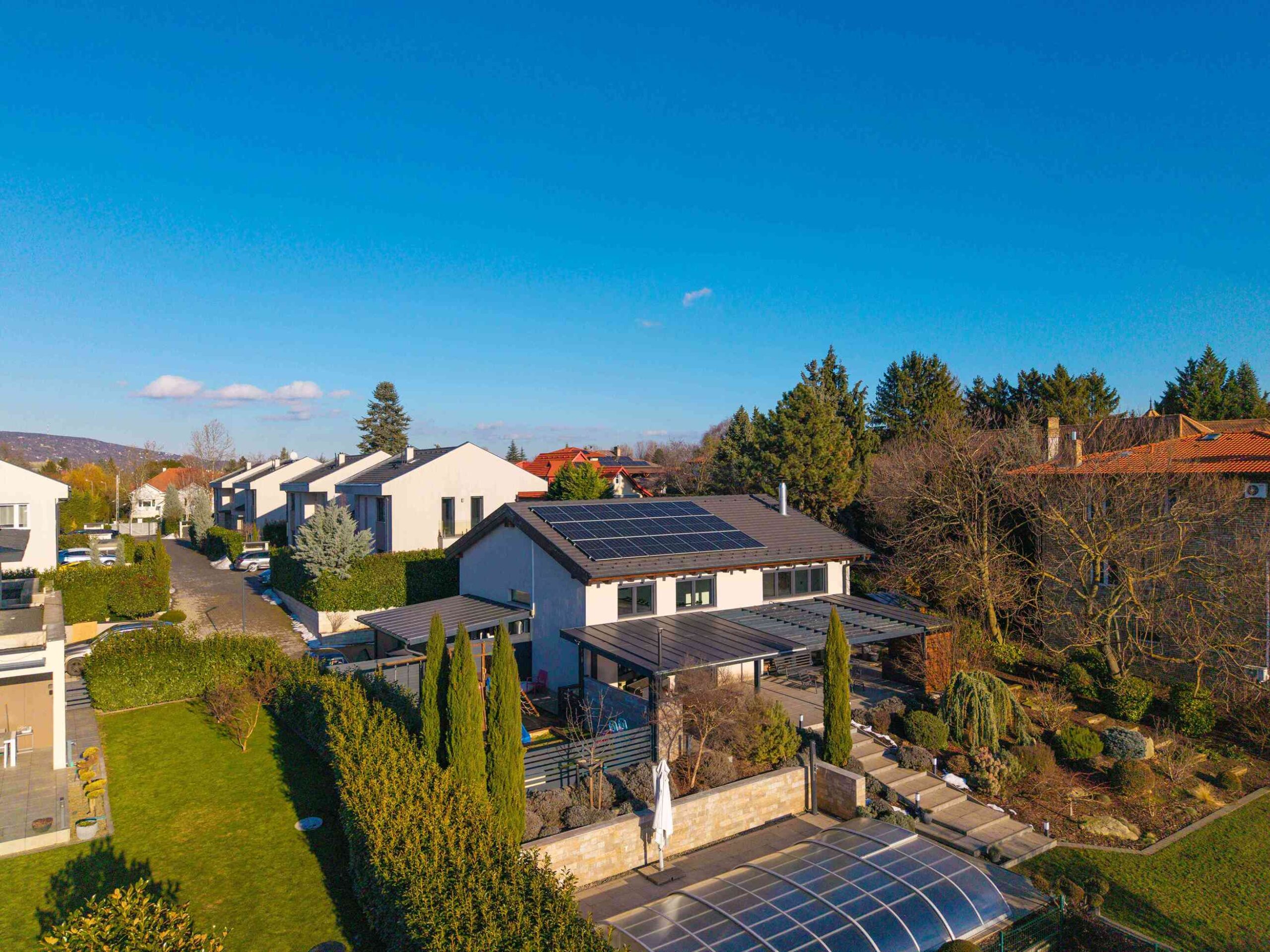 A 74 m²-es fedett terasz kerti konyhával és kültéri nappalival valódi plusz életteret biztosít. A kert teljes szélességében panorámás, gondozott kialakítású. 3×8 méteres, fűthető, sós vizes medence, magaságyások és zárt gyermekjátszótér található benne.