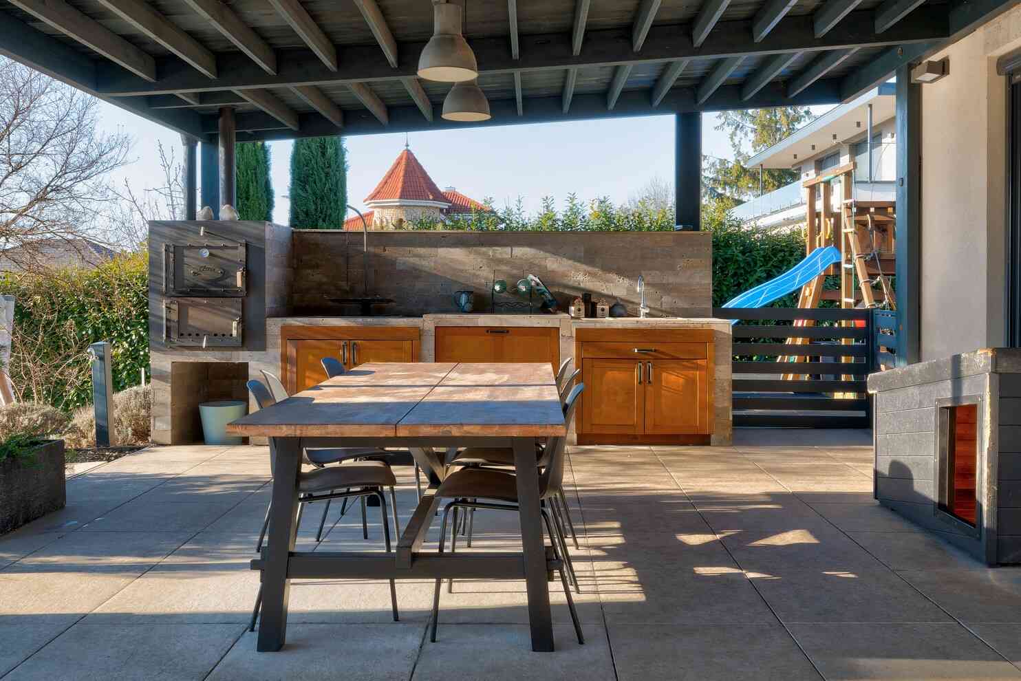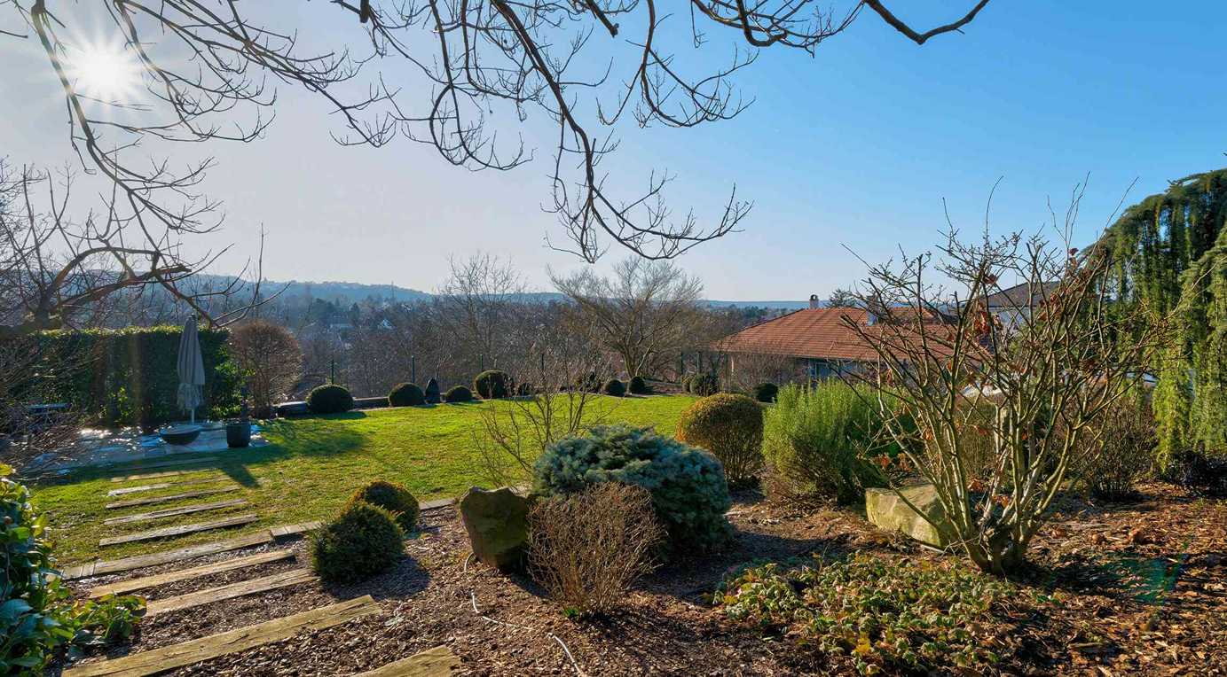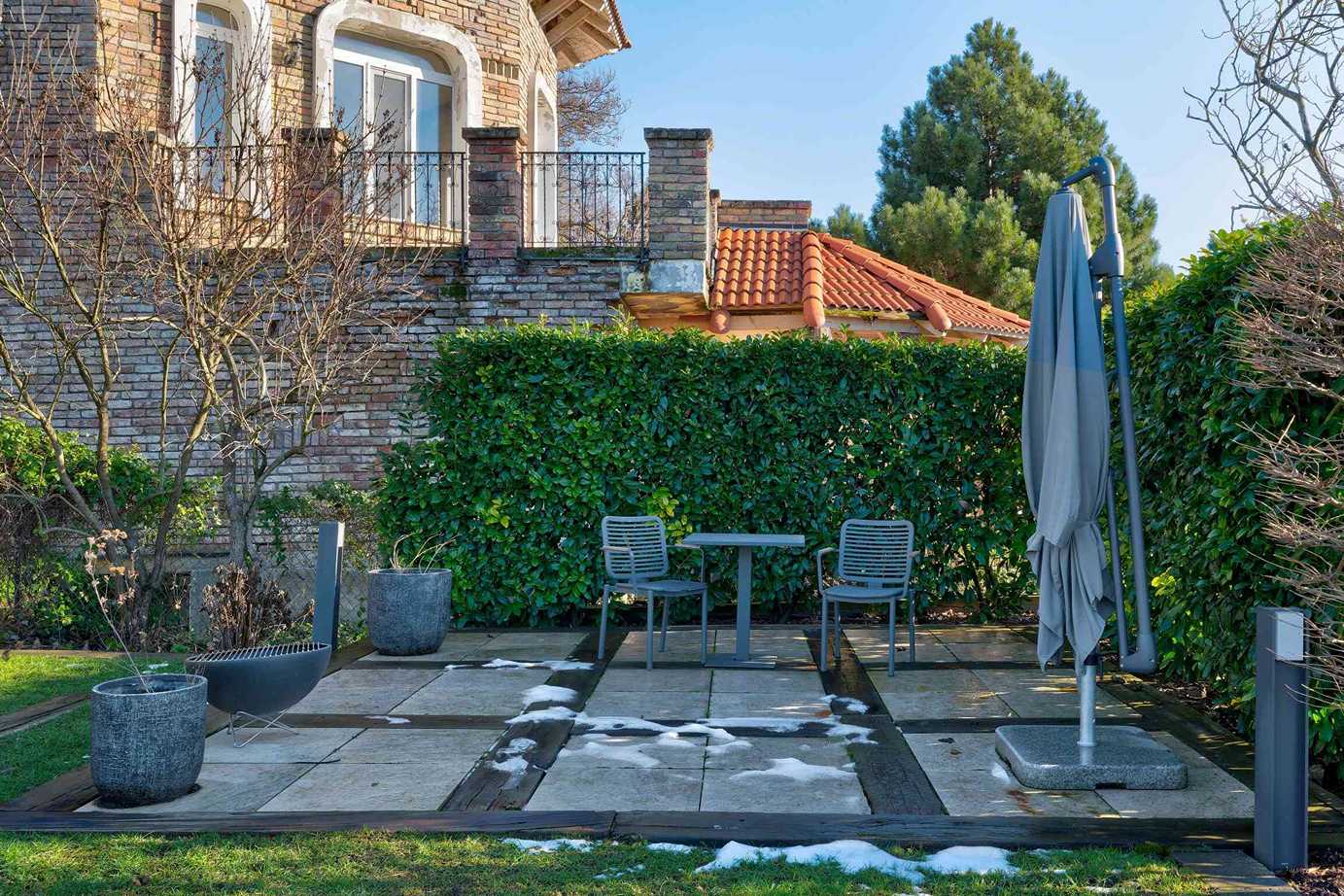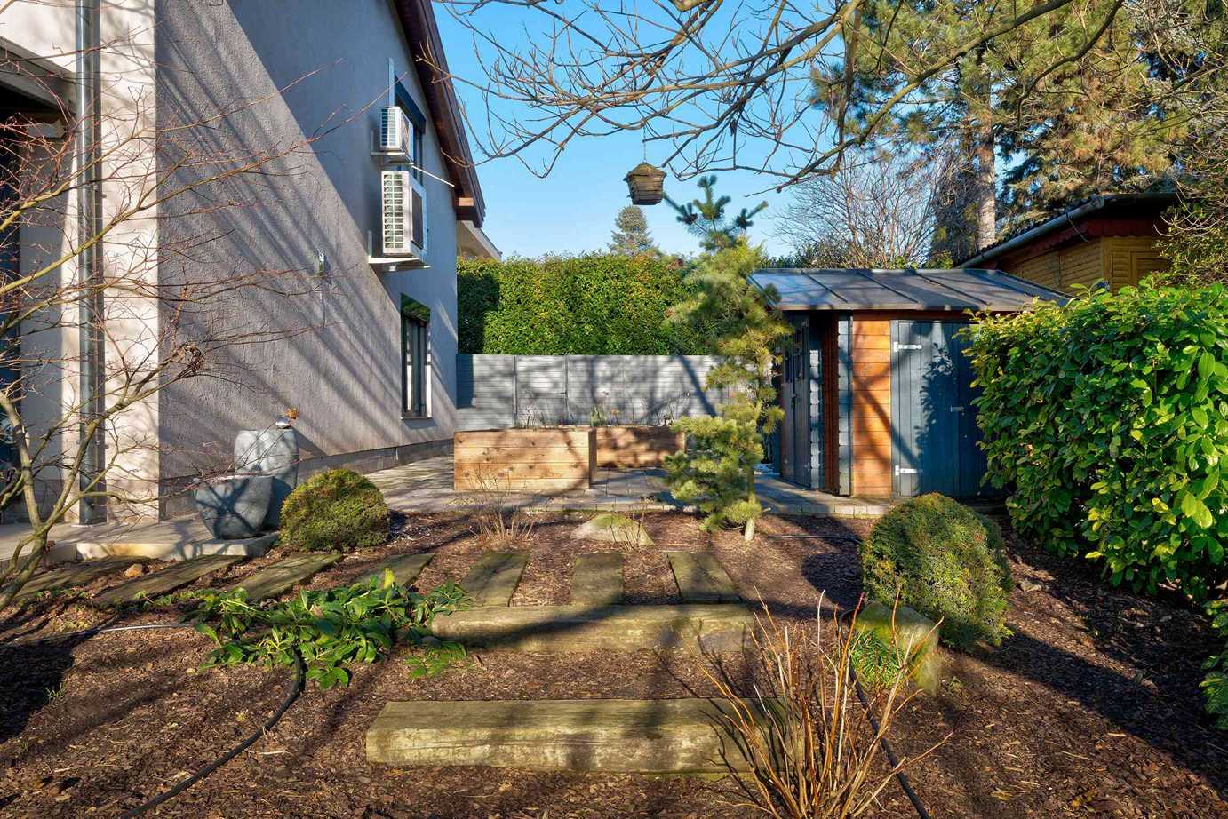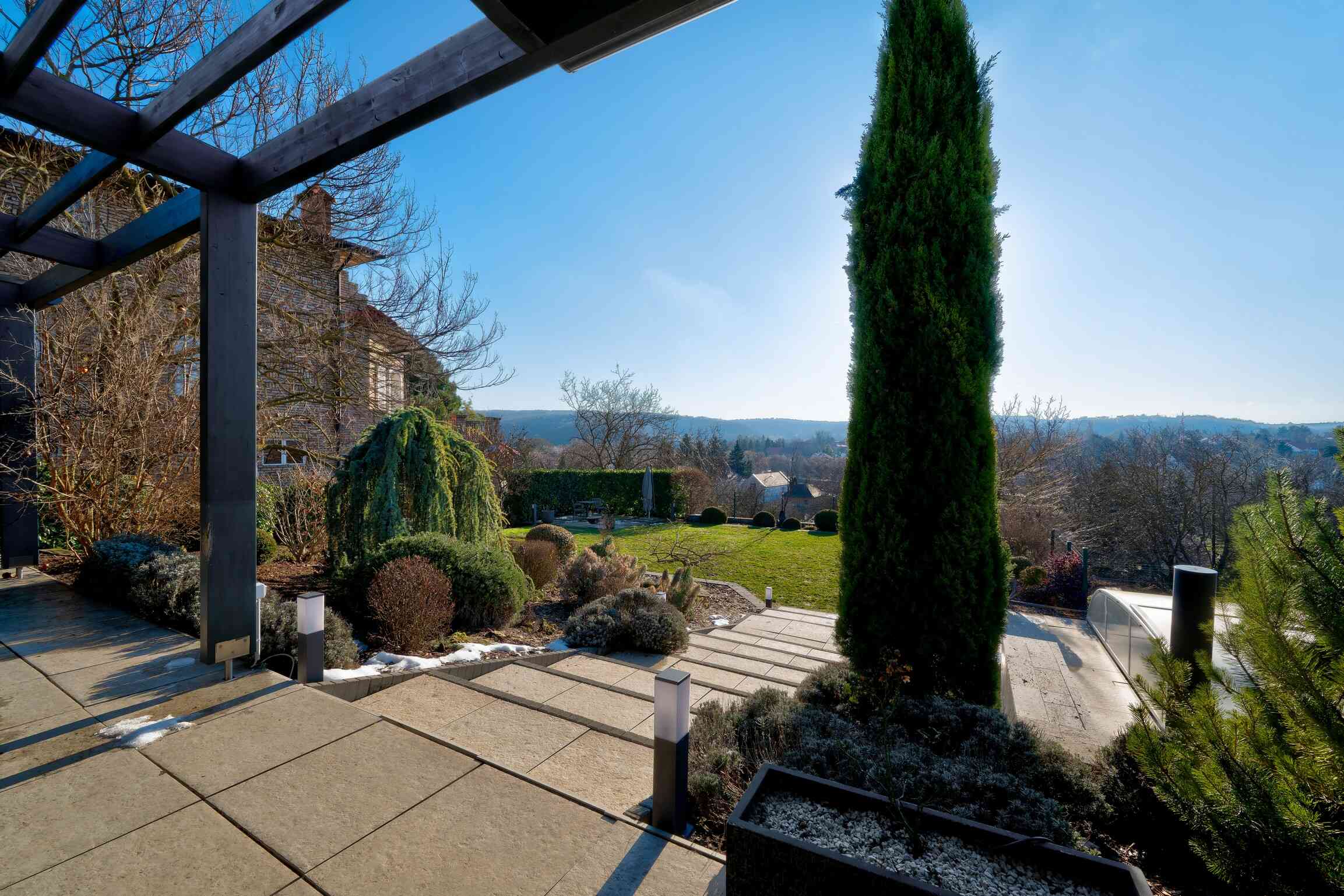 A 74 m²-es fedett terasz kerti konyhával és kültéri nappalival valódi plusz életteret biztosít. A kert teljes szélességében panorámás, gondozott kialakítású. 3×8 méteres, fűthető, sós vizes medence, magaságyások és zárt gyermekjátszótér található benne.