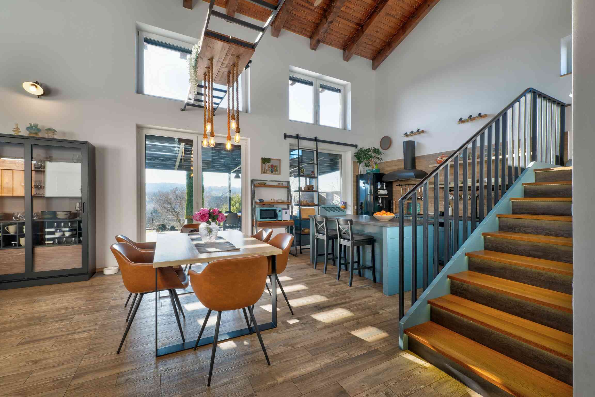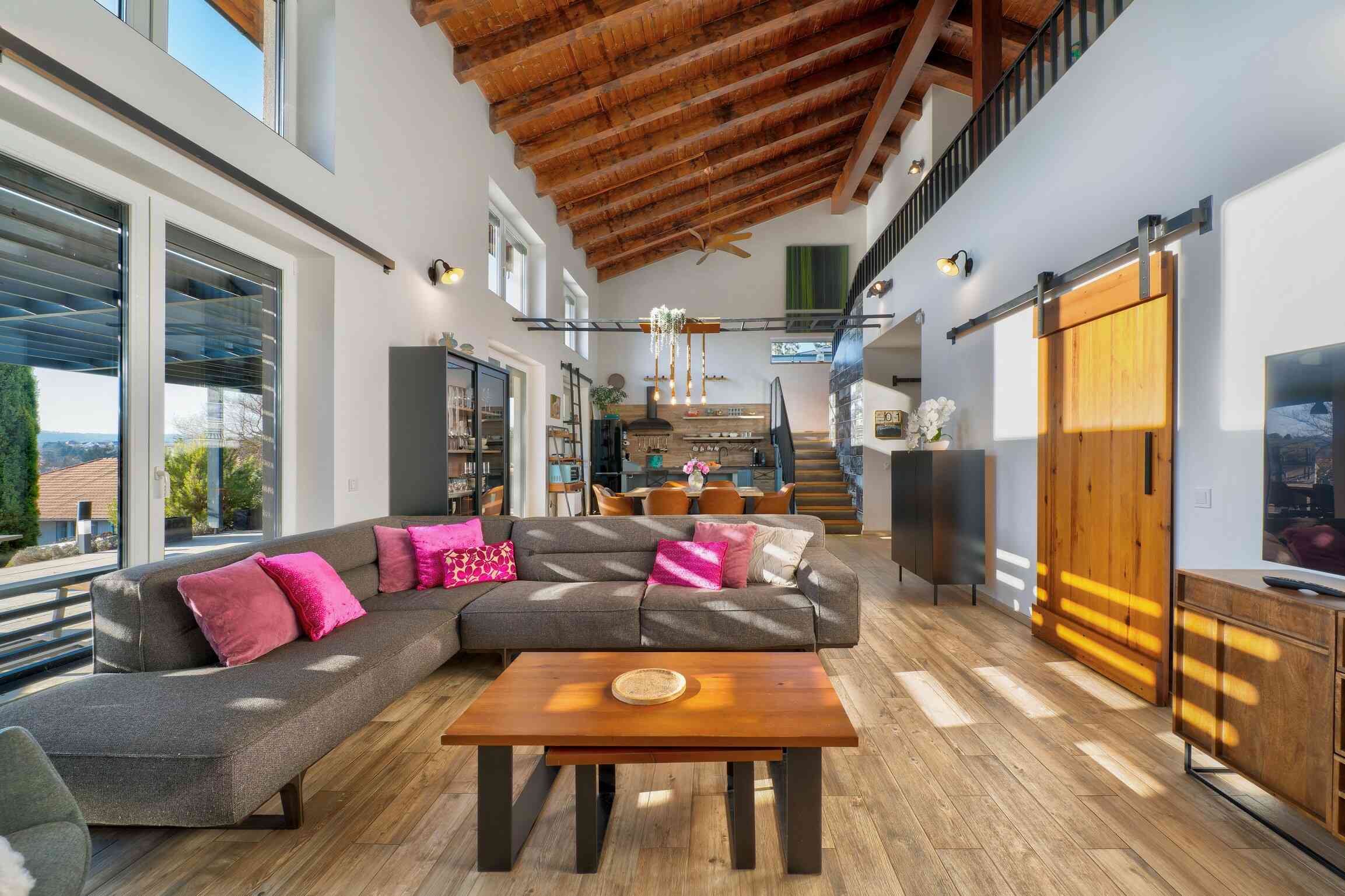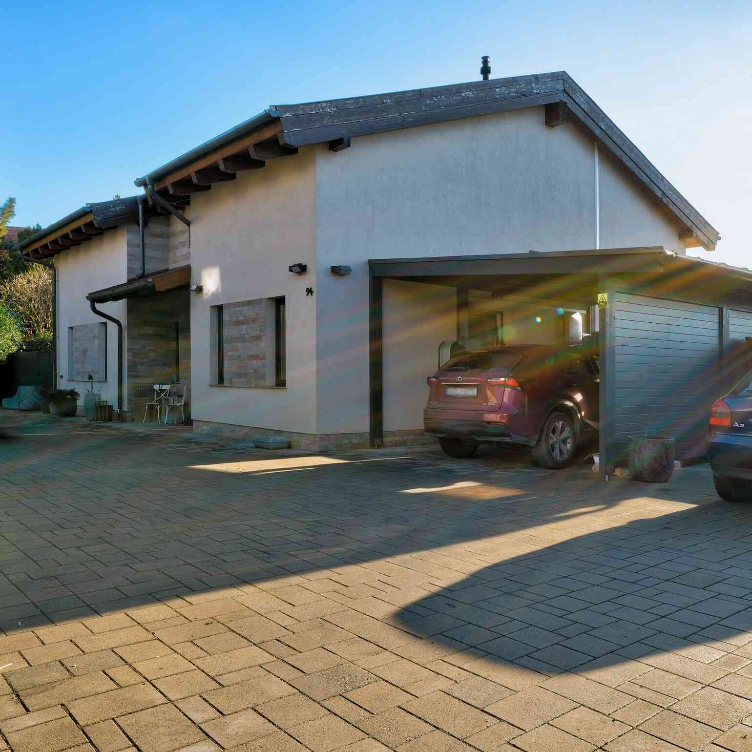Stílusában meleg hangulatú, modern farmház jellegű otthon, természetes és időtálló megoldásokkal. Garázs nincs, de közvetlenül a ház mellet fedett autóbeálló van.
